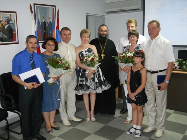 Тринадцать семейных пар - семей российских военнослужащих, из городов Ванадзор, Гюмри, Ереван, Степанаван, молоканского села Фиолетово за многолетнюю крепость семейного союза получили из рук первого секретаря Посольства России в Армении, заместителя руководителя Представительства Россотрудничества в Армении, Марка Калинина медали и грамоты.